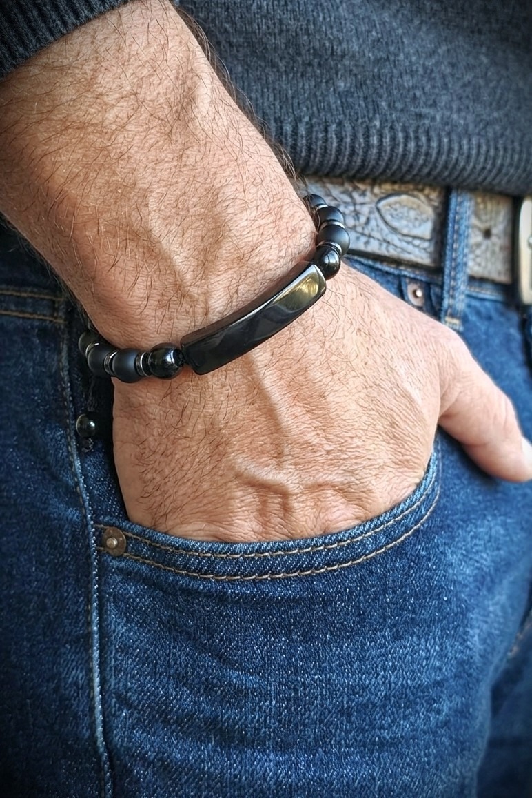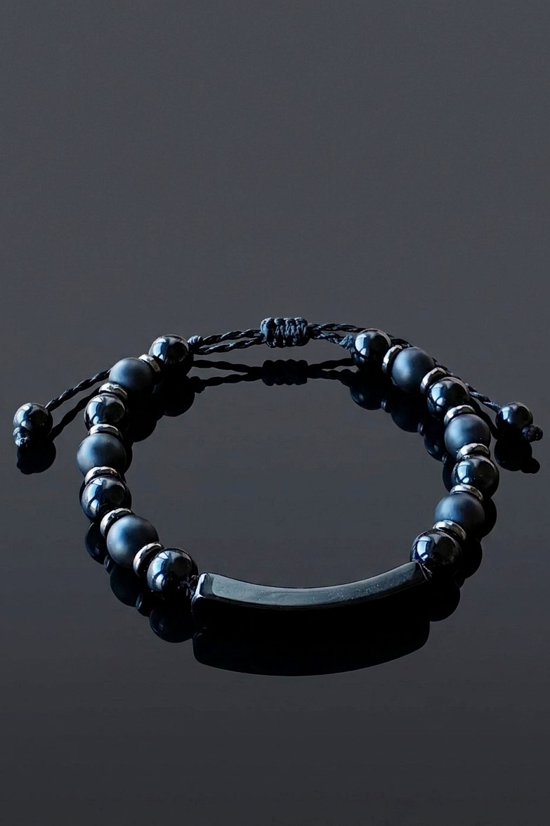 Käevõru kombineerib meisterlikult läikivad ja matid musta ahhaadi helmed ja terashallid väikesed vahelülid. Neid kroonib poleeritud kaardus mustast ahhaadist keskdetail.