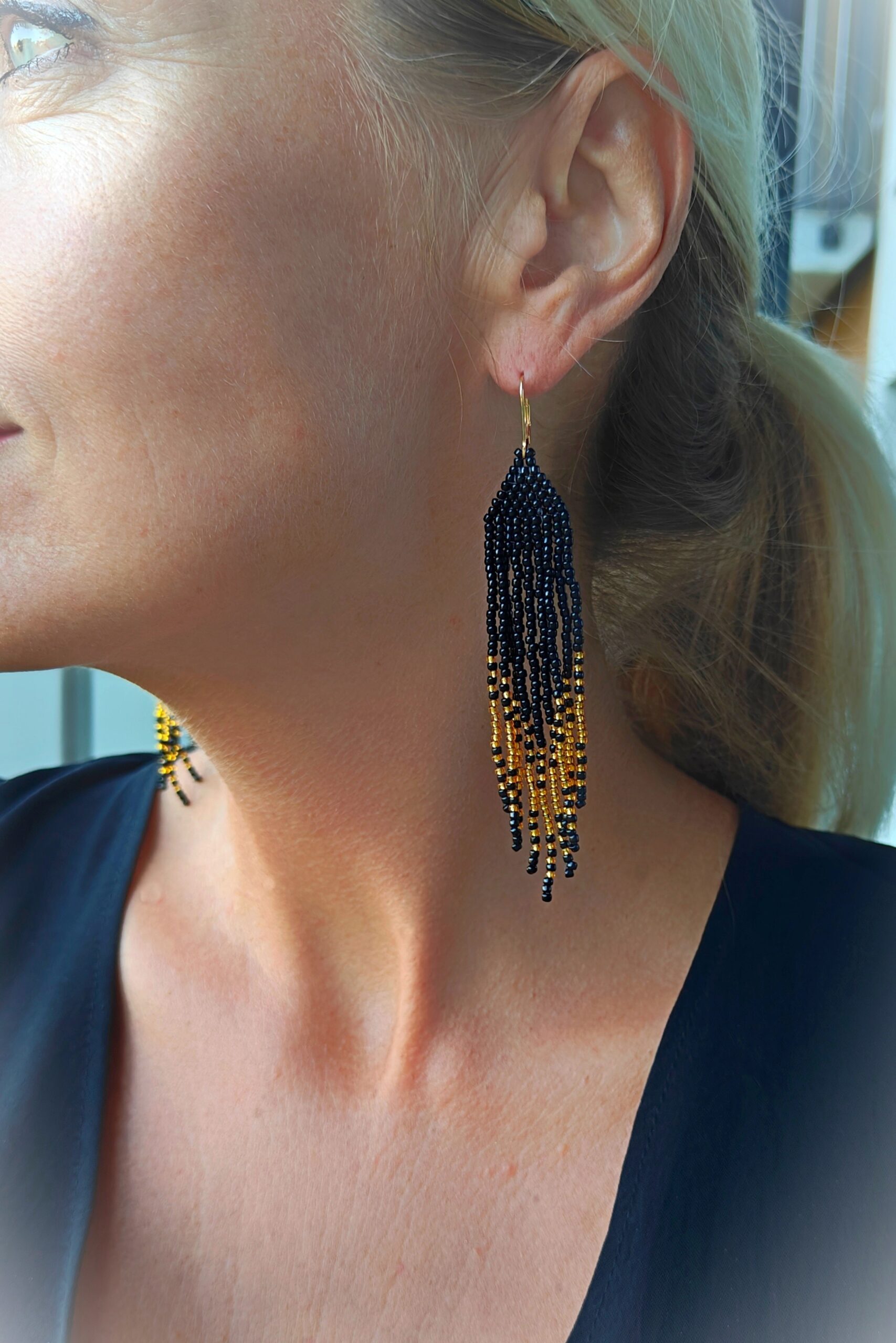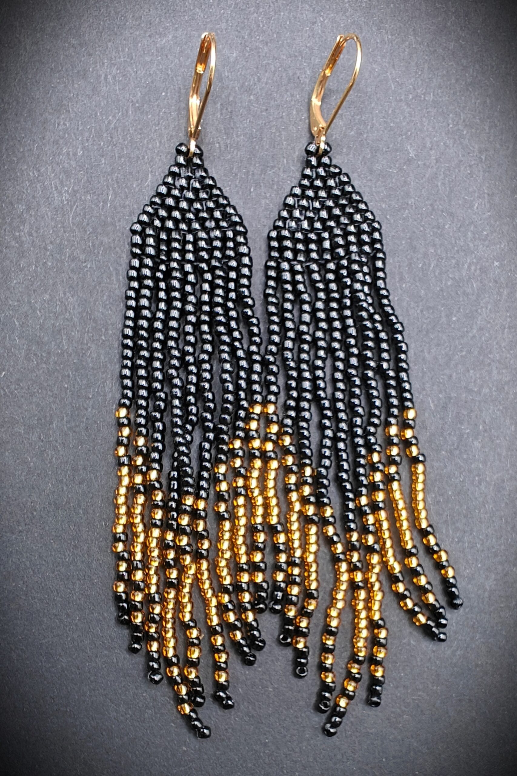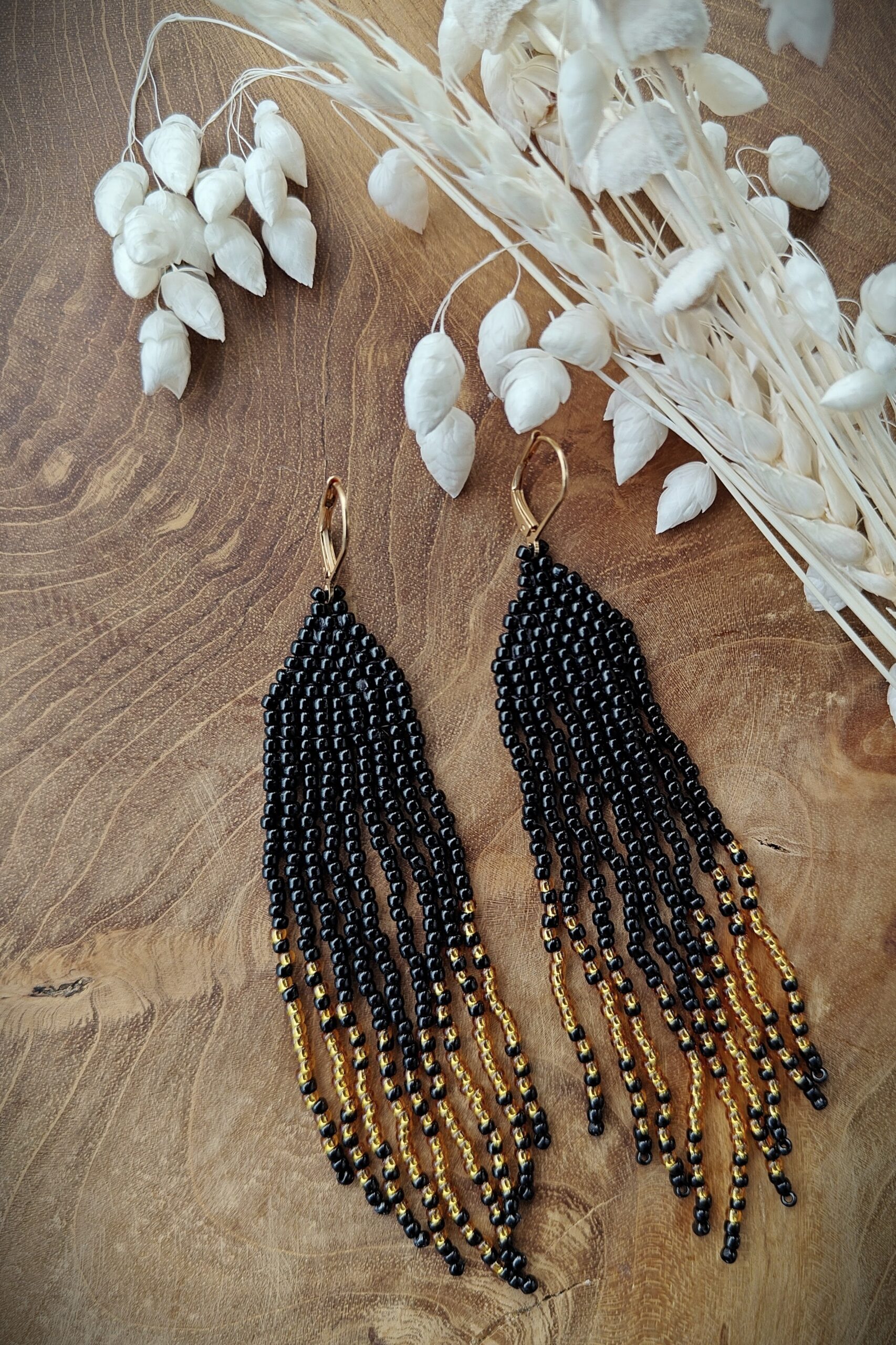 Seemnehelmestest kõrvarõngad “Must ja Kuld” on elegantsed ja kerged käsitööna valminud kõrvarõngad, mis on valmistatud kvaliteetsetest seemnehelmestest. Need käsitööna valminud kõrvarõngad on naiselikud ja kerged, sobides nii igapäevaseks kandmiseks kui ka pidulikemaks hetkedeks. Kõrvarõngad on õhulised, kaunilt liikuva rippuva disainiga ning mugavad kanda terve päeva.