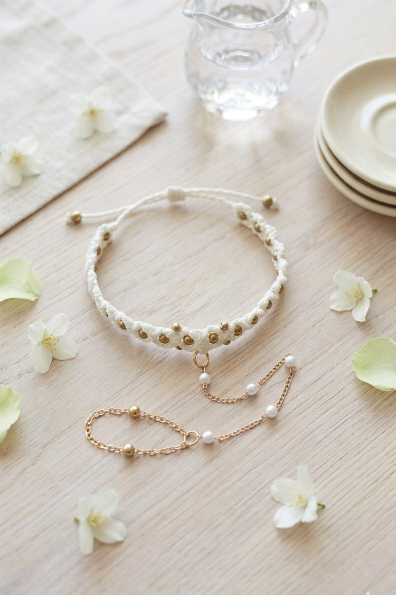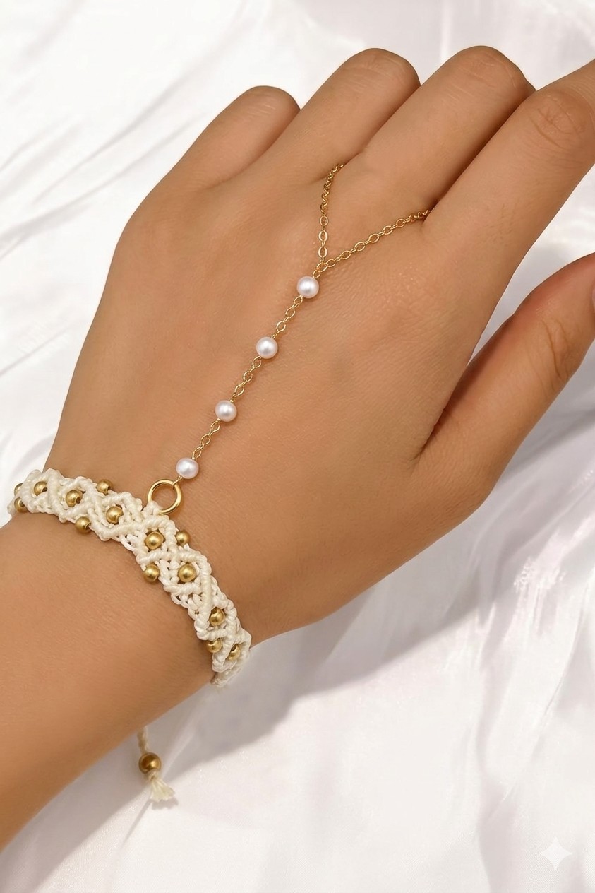 See ehe kombineerib traditsioonilise makramee-tehnika, kuldsed detailid ja õrna pärliketi, luues täiusliku tasakaalu loodusläheduse ja elegantsi vahel.