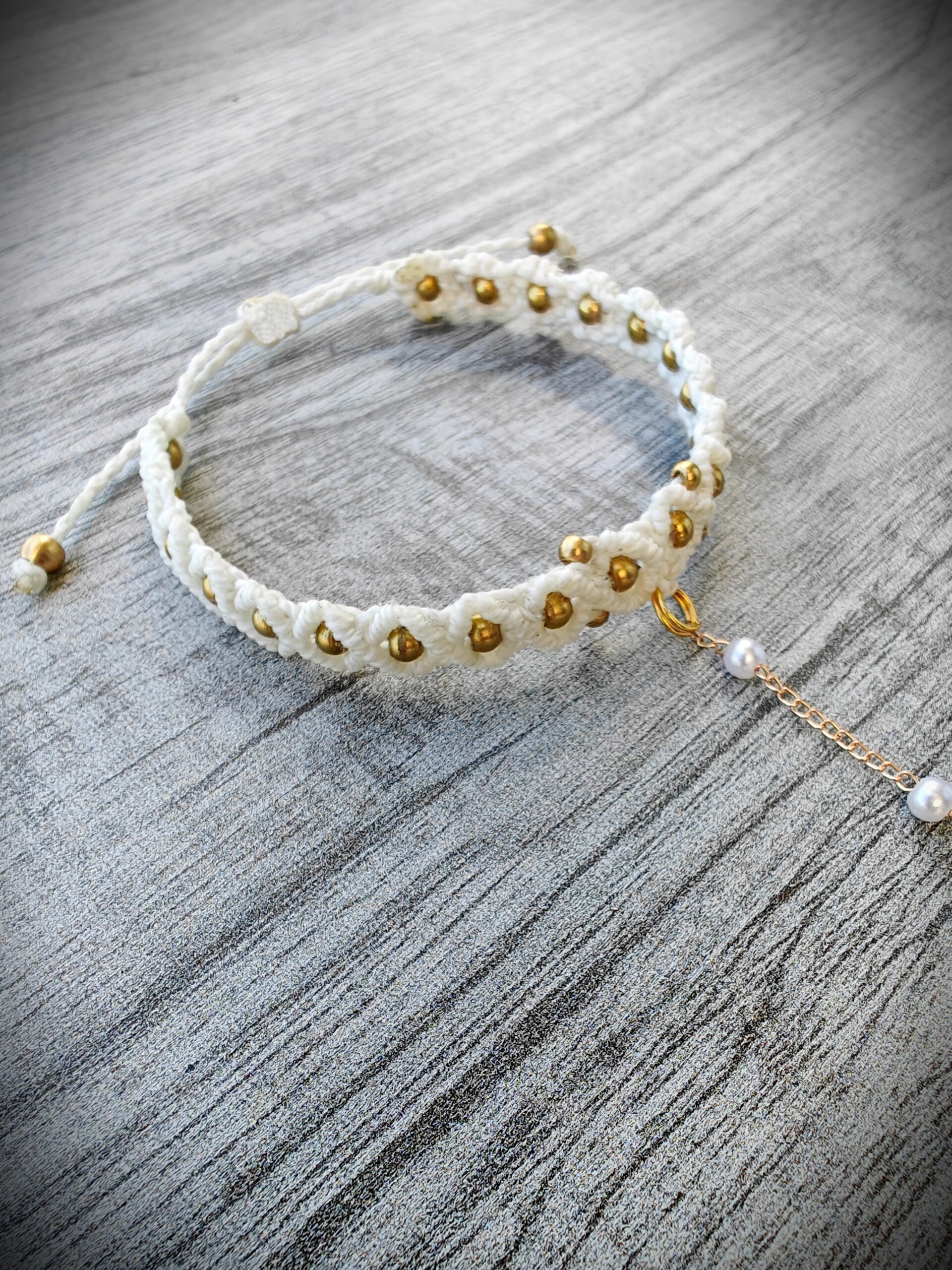 Idamaise hõnguga  elegantne ja õhuline makramee-käevõru kuldsete messingist detailide ja pärliketiga.